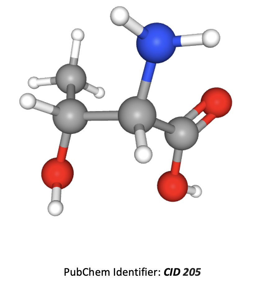 The molecule is 2-amino-3-hydroxybutanoic acid. The second and third carbon atoms have four different substituents attached and so are chiral. The first carbon (CH3) and the last (CO2H) do not, so are not chiral (any carbon in a double bond cannot be chiral).