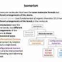 Isomers are molecules that have the same molecular formula but different arrangements of the atoms. Structural isomers (see Fundamentals of organic chemistry 10.1) have different arrangements of the bonds in the molecule. Stereoisomers have the same bonds, but different arrangements of the atoms in three-dimensional space. This is a short section, but there is a lot of new vocabulary to get the head around.