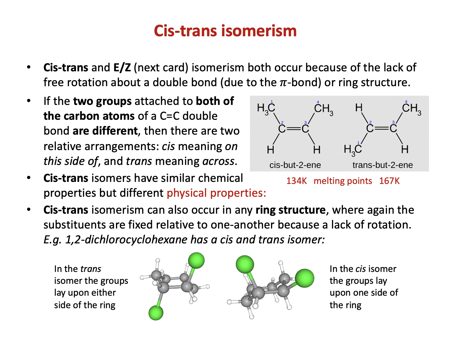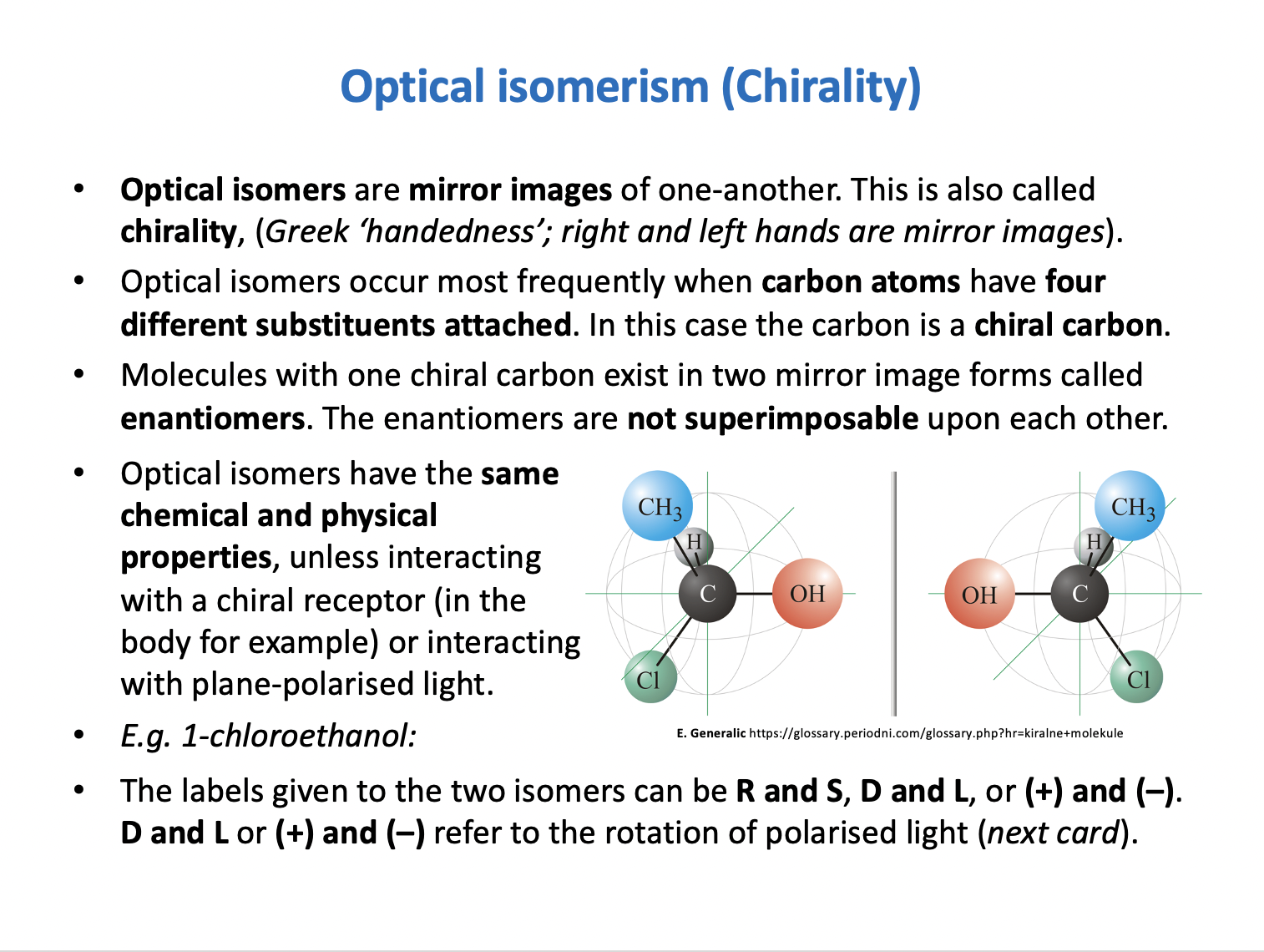 Cis or Z (zusammen) isomers, Trans or E (entgegen) isomers, Enantiomers*, A chiral carbon (chiral centre)*, Optical activity, A racemic mixture (racemate)*
