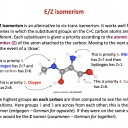 In E/Z isomerism each substituent is given a priority according to the atomic number (Z) of the atom attached to the carbon. Moving to the next atom in the event of a ‘draw’. The highest substituents on each carbon atom are then compared to see if they are E (entgegen) or Z (zusammen) relative to one-another.