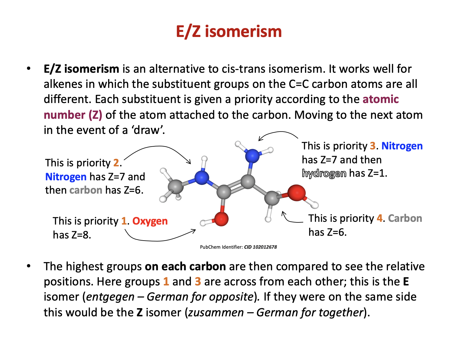 In E/Z isomerism each substituent is given a priority according to the atomic number (Z) of the atom attached to the carbon. Moving to the next atom in the event of a ‘draw’. (The highest substituents on each carbon atom are then compared to see if they are E (entgegen) or Z (zusammen) relative to one-another.)