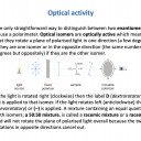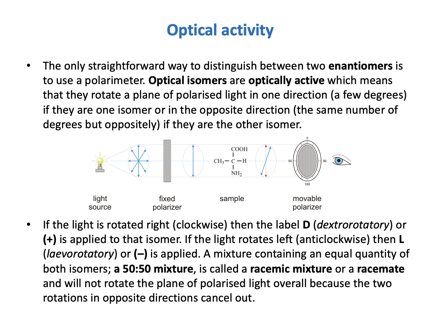 Optical activity is shown by compounds with mirror image isomers (enantiomers). In order to be optically active, compounds must contain a chiral carbon atom - that is a carbon atom with four different substituents attached.