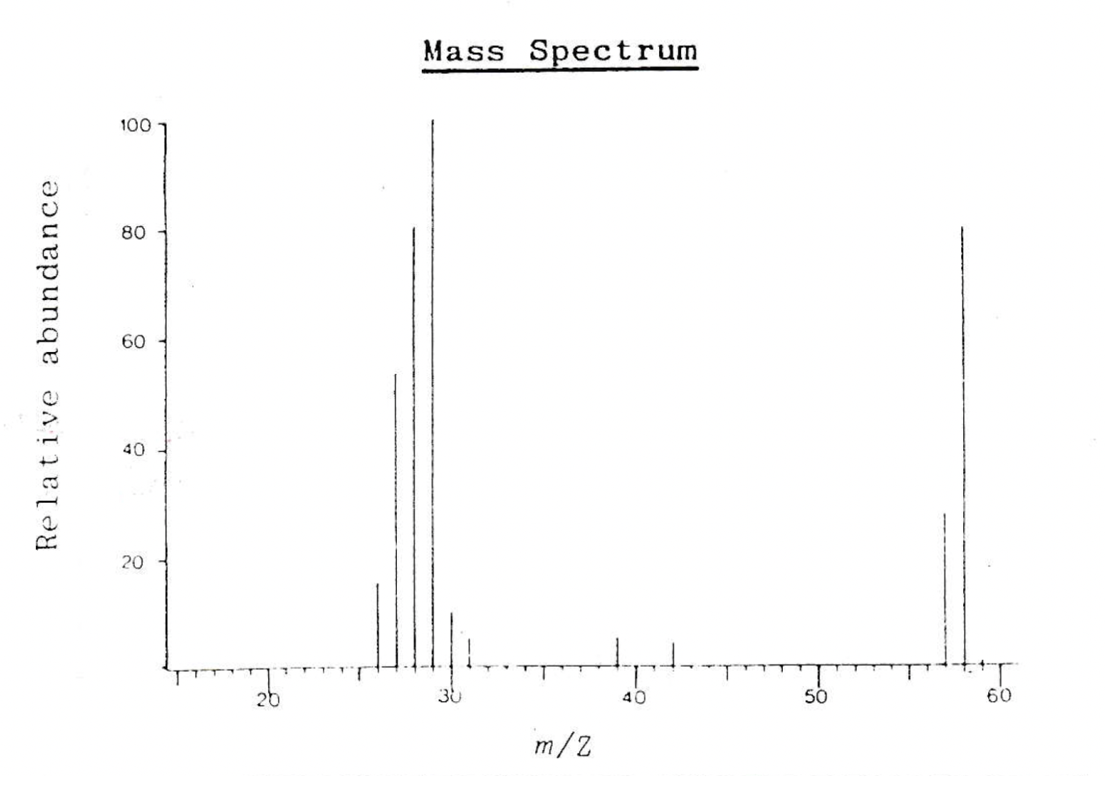 The molecular ion peak in the mass spectrum is at 58 m/z. All three compounds given have an integer mass of 58.