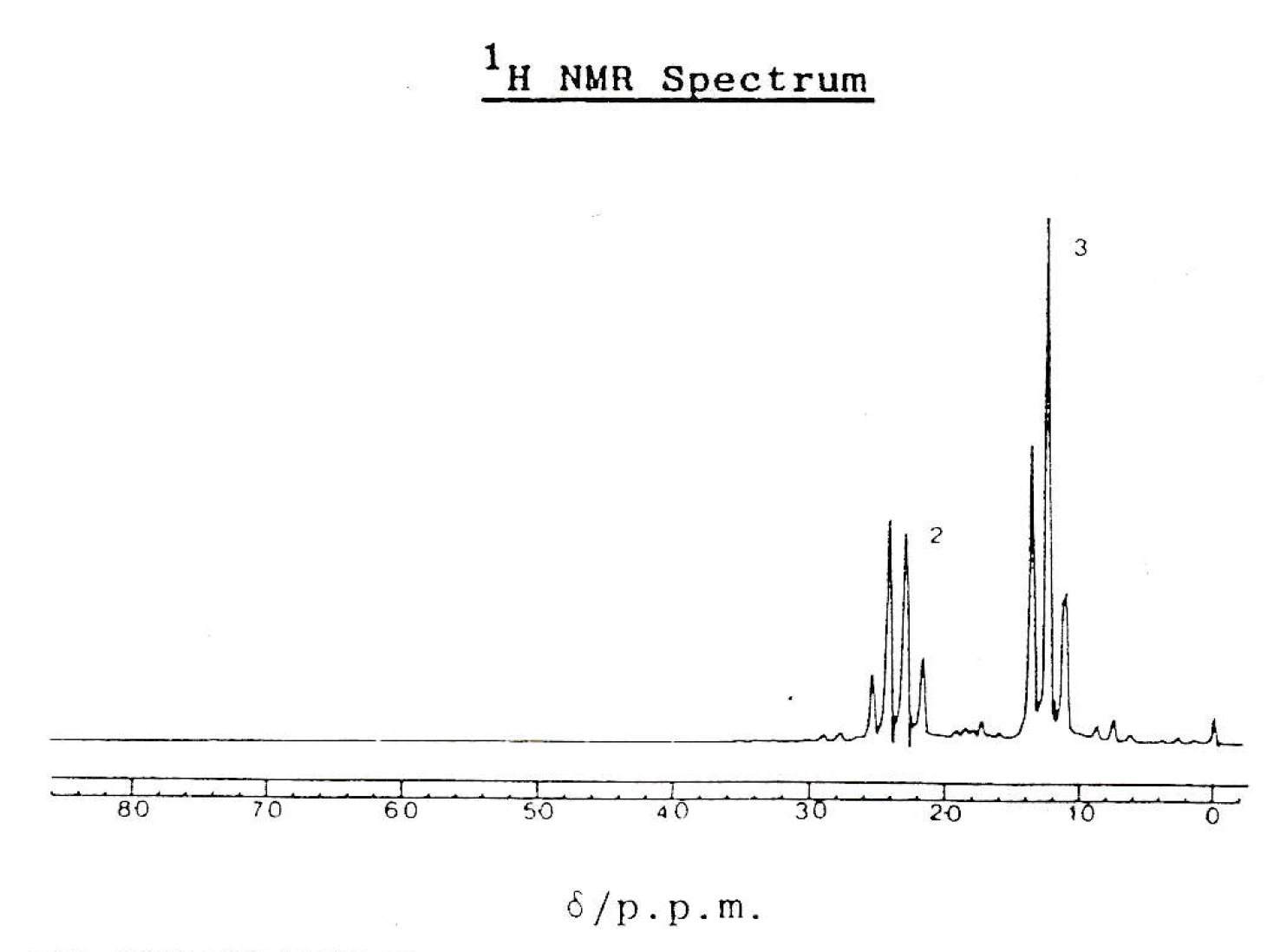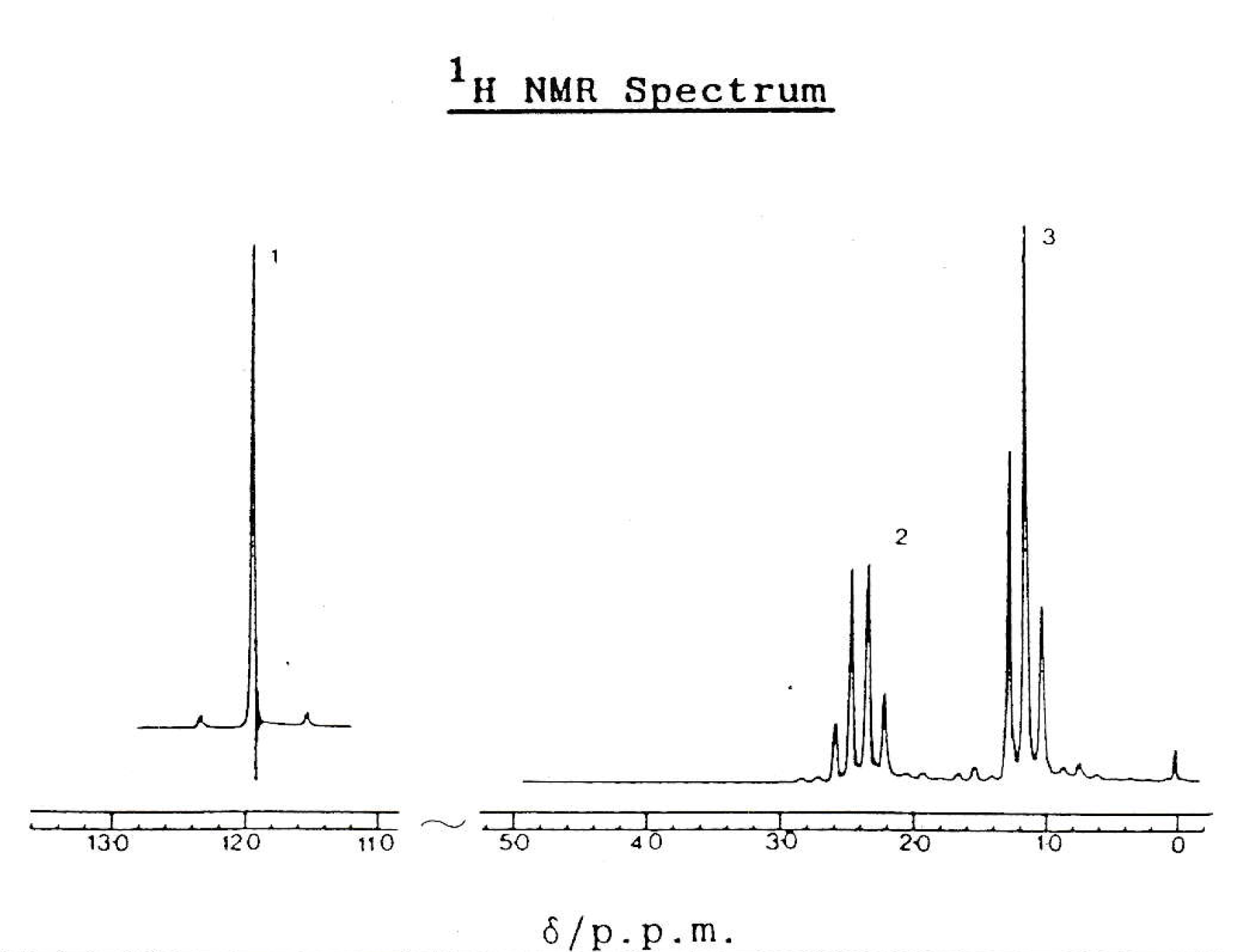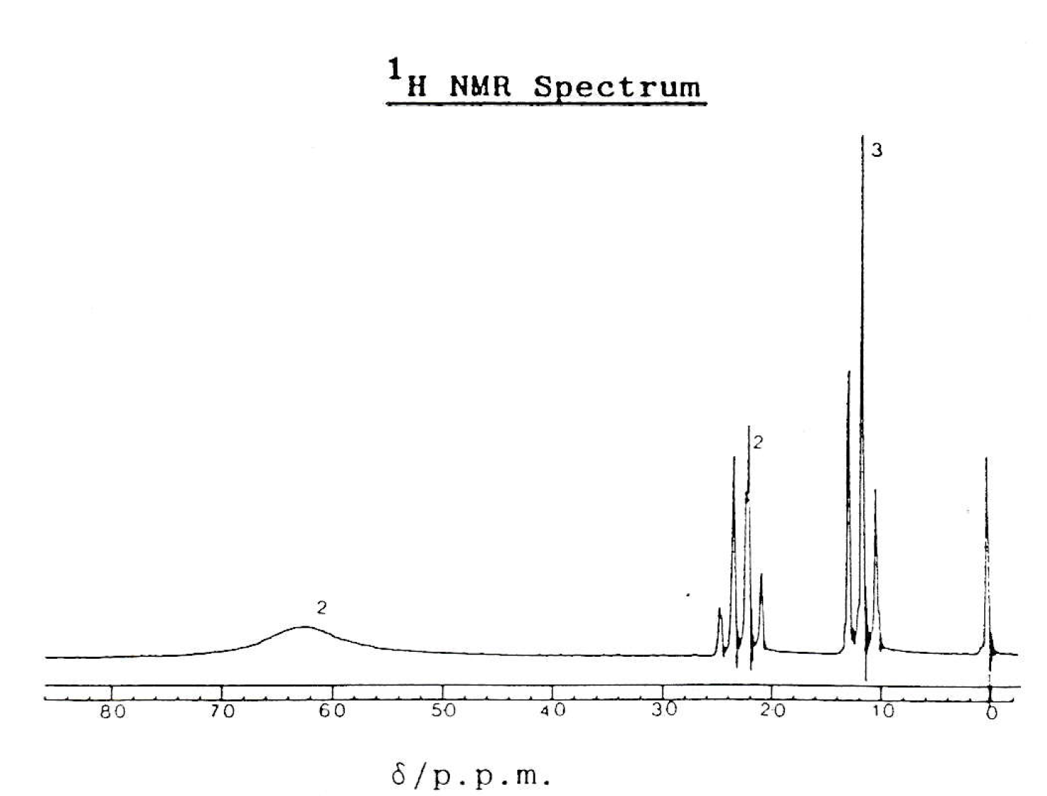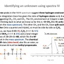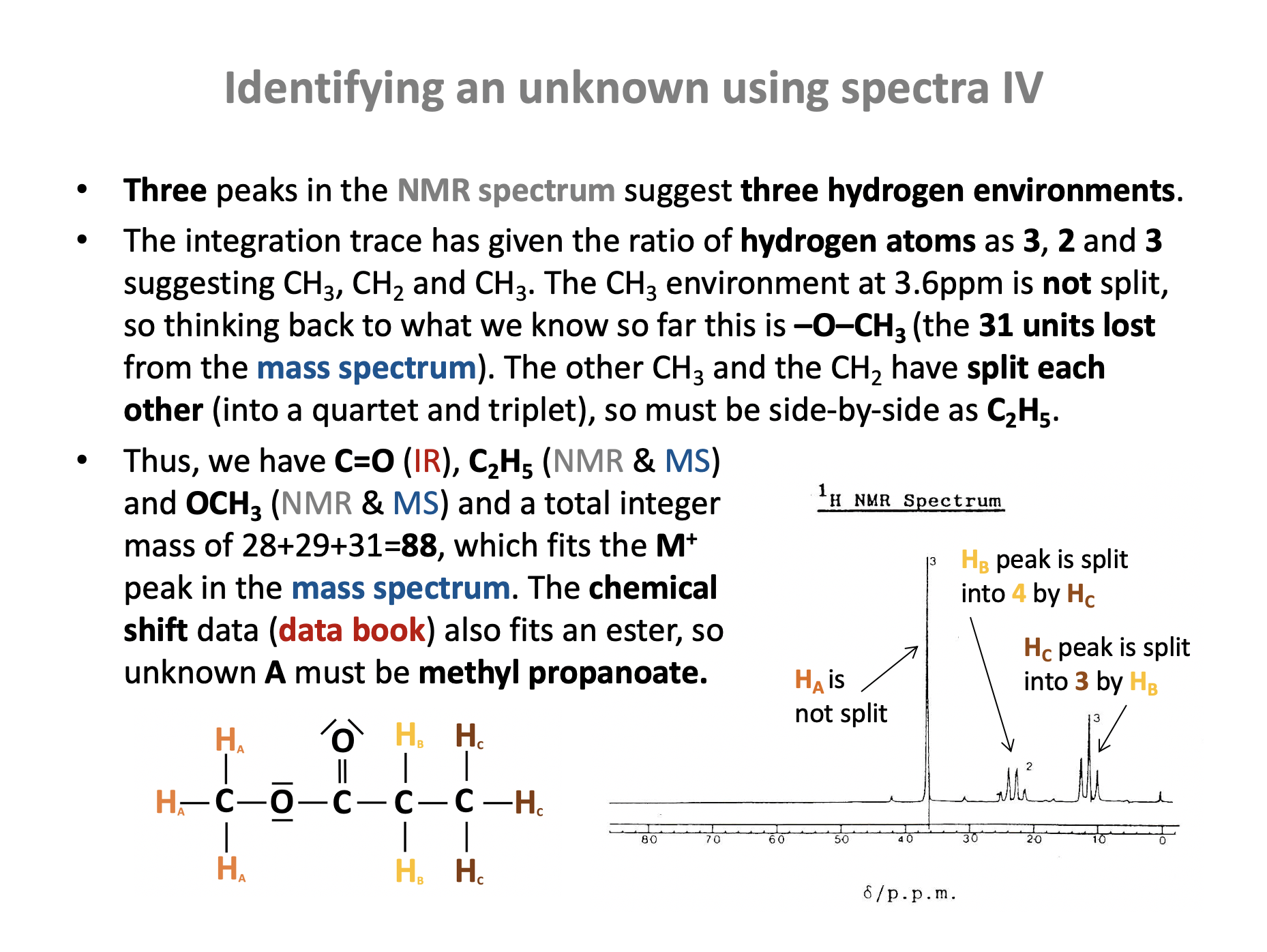 The NMR spectrum shows three hydrogen environments, with hydrogen ratio of 1:2:3. This fits with all three compounds. The splitting pattern fits with propanol and propanoic acid (as we do not expect an O−H hydrogen to split or be split), although not with propanal (as we might expect the H on CHO to split and be split). However, the singlet O−H peak is shifted far down field, which is more characteristic of a carboxylic acid.