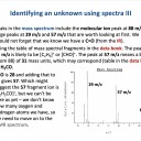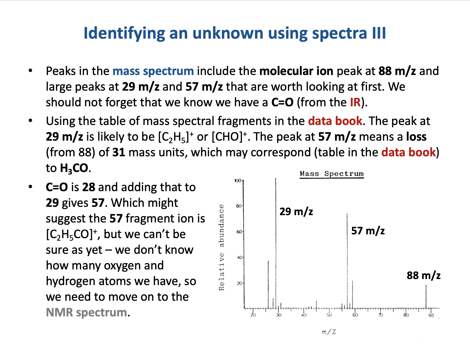 The largest peak in the mass spectrum is at 29 m/z. This could correspond to fragment ions [C2H5]+ or to [CHO]+, (both noted in the table in the data book) both of which are very likely to be produced by propanal. Propanone would not produce a peak at 29; we would see peaks at 15 and/or 43 m/z.