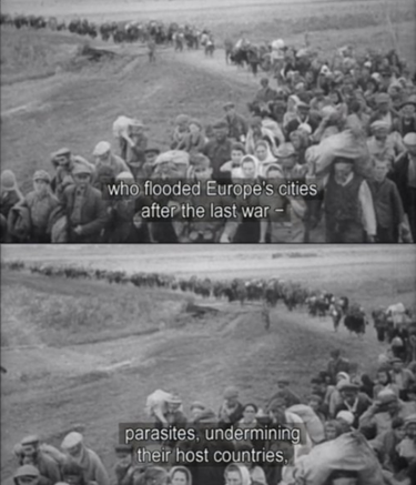 The image displays Jewish concentration camp members walking in a large crowd towards the forefront of the frame. The line of people fades off into the distant background, becoming increasingly blurry, and giving the impression of an endless stream of people surging towards the camera. The people in the picture are wearing dirty and worn-out clothes, and are carrying bags and sacs above their heads. The image is in black and white, giving it a somber and muted mood. The original propaganda film had a recording speaking over the footage, and the translated subtitles from the film read “who flooded Europe’s cities after the last war – parasites, undermining their host countries.” The “who” they are referring to, are immigrants who after the First World War, migrated across the borders into Europe in search of work. The use of emotive such as “flooded”, suggest an uncontrolled surge of people, overflowing Europe’s population. Also used is the metaphor “parasites”, which is once again used to describe the immigrants feeding from the host country. The portrayal of such mentality towards immigration bares a strikingly worrying resemblance to popular societal mentality. The employment of such a comparable image to this in the UKIP Breaking Point poster demonstrates that a disturbing cyclical pattern is emerging regarding public sentiments towards immigration. Although we as a society no longer scapegoat Jewish immigrants, but rather Islamic refugees, this demonstrates that scapegoating is still occurring in popular media.