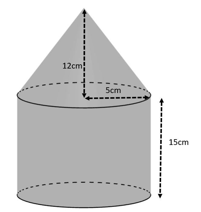 The radius is 5cm, the height of the cone is 12cm and the height of the cylinder is 15cm.