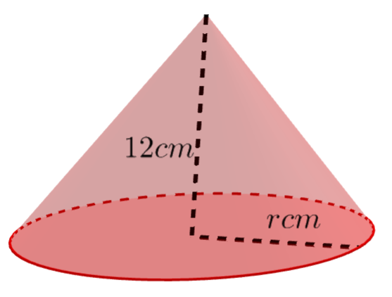 A cone with a height of 12cm has a volume of \(\large 100\pi \ cm^3\)