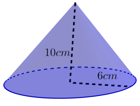 \(\large V=\frac{1}{3}\pi r^2h\\ \large V=\frac{1}{3}\pi \times6^2\times10=120\pi\)