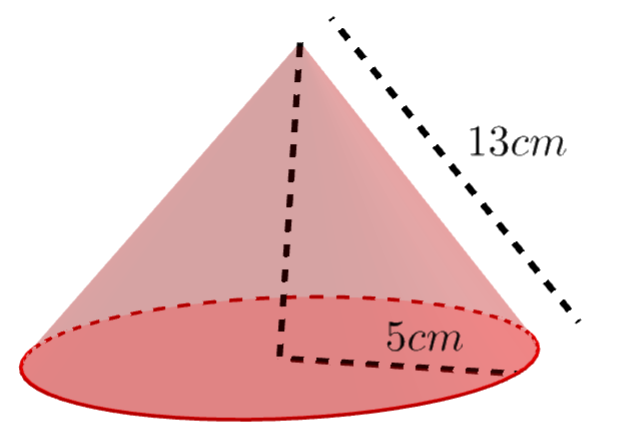\(\large A_{cone}=\pi rl\\ \large A_{cone}=\pi\times5\times 13\\ \large A_{cone}=65\pi\)