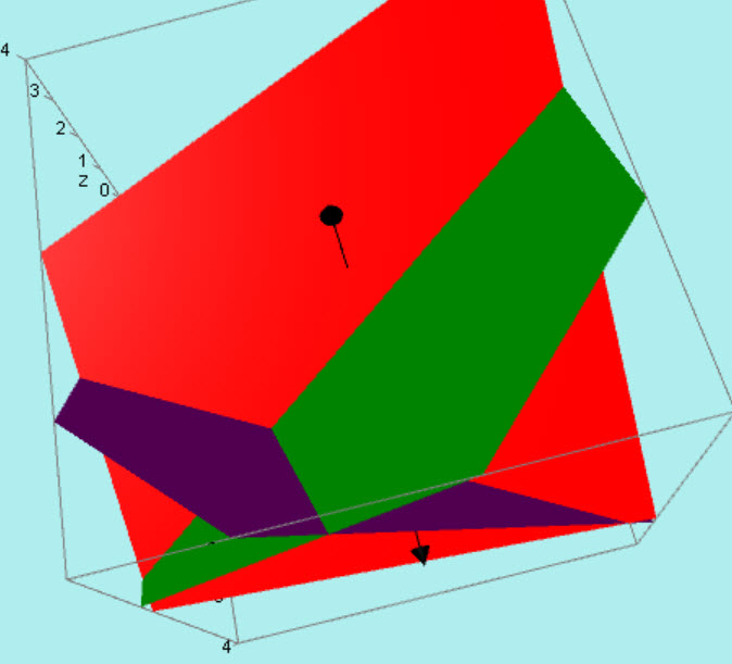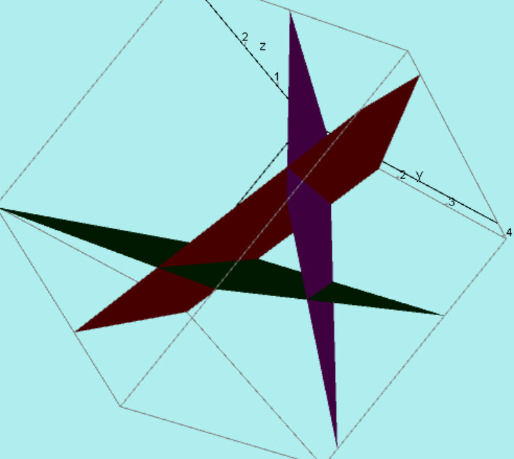 This page is all about how planes meet (or not). Two planes will either be parallel or meet at a line. Three planes will either 1) not meet - zero solutions, 2) meet at a point - unique solution, or 3) meet at a line (or plane) - infinite solutions. We will look at how to recognise each situation and how to find the solutions. This work overlaps with finding solutions to systems of linear equations.