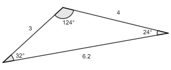 cos 124° = \(\frac{3^2+4^2-6.2^2}{2\times3\times 4}\)