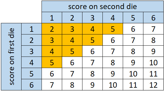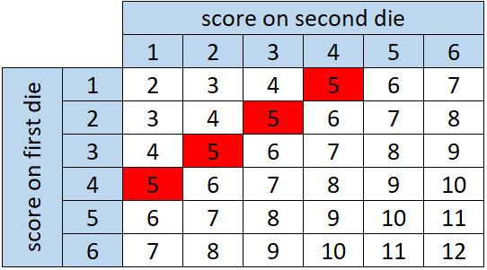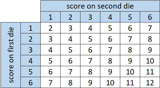 The possibility space below shows the outcomes when two dice are rolled and their scores are added together