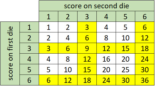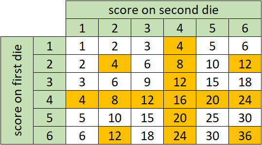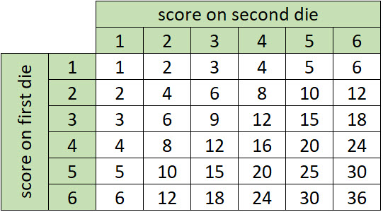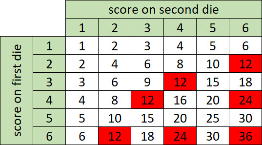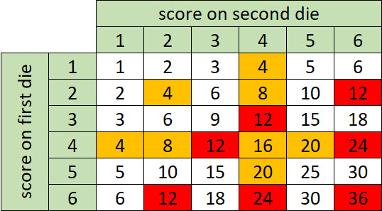 The possibility space below shows the outcomes when two dice are rolled and their scores are multiplied together