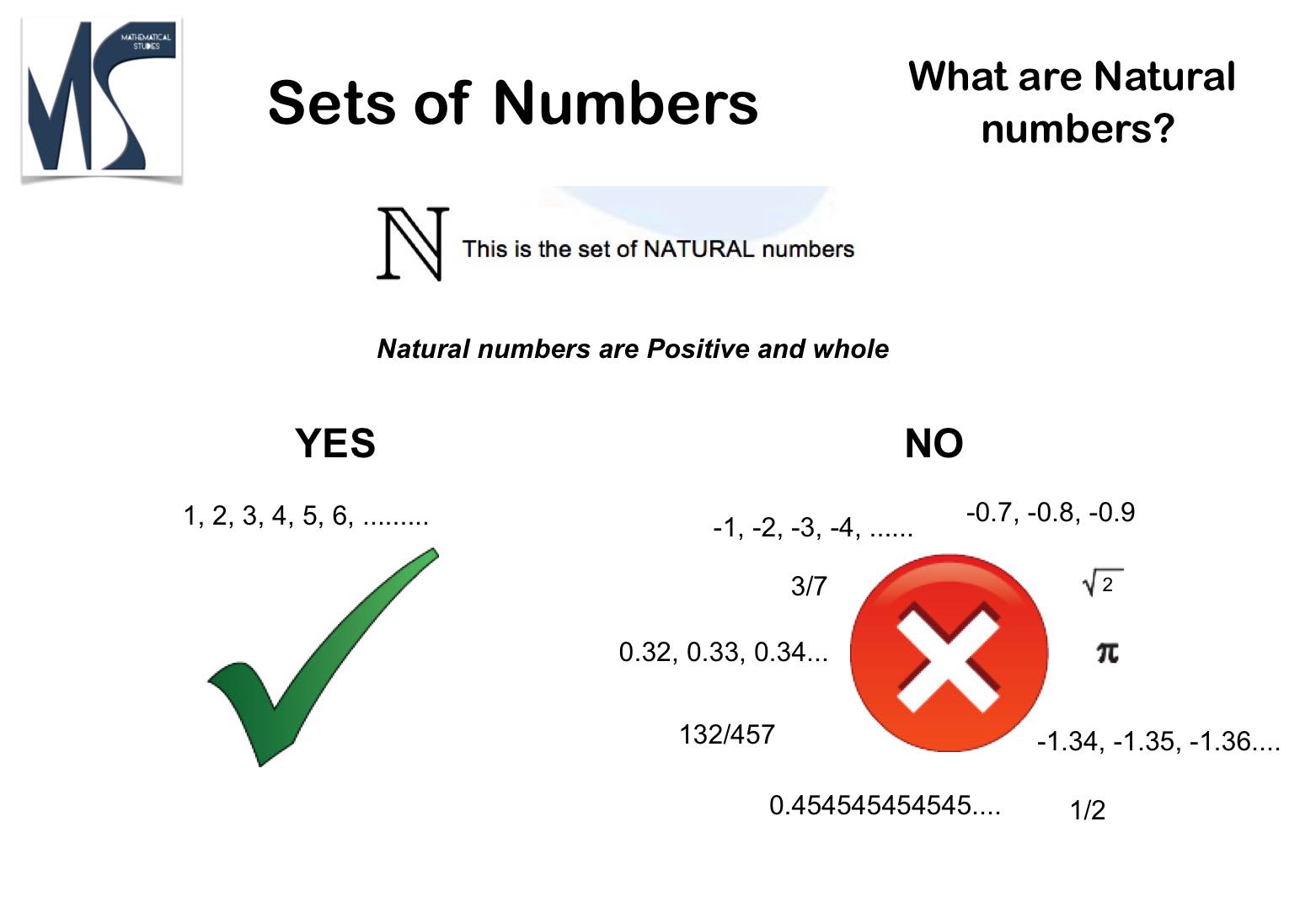 The set of Natural numbers is all positive, whole numbers. This does not include any negative numbers or fractions.