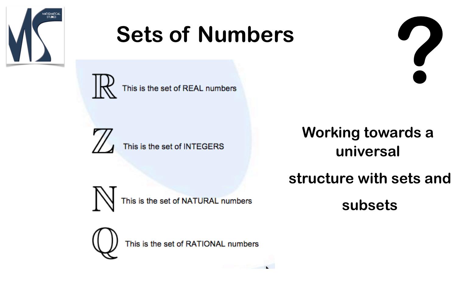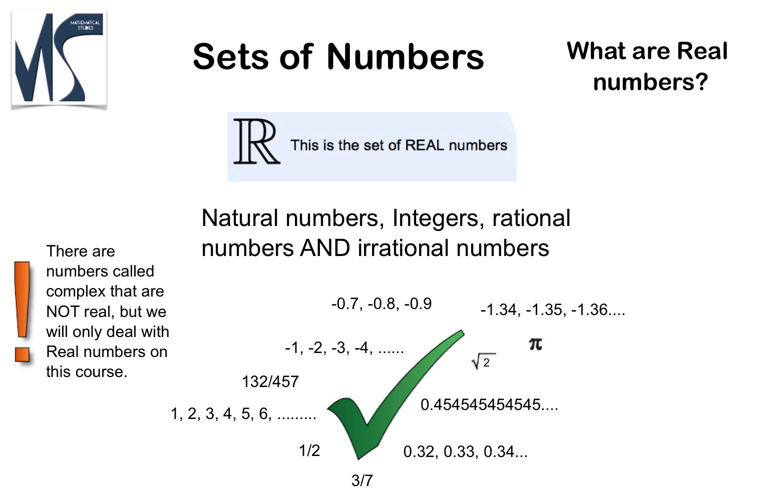 This sub topic is about the 4 key sets of numbers that define our number system. Natural numbers, Integers, Rational numbers and Real numbers. This section starts by taking you through the concept of number sets, starting with sets that we have been using for years, like even numbers. Then there is a little about how the sets have evolved followed by some key definitions of the four sets and example of how they fit together. Then, as usual, the section finishes with some revision exercises asnd examples of how this concept is tested.