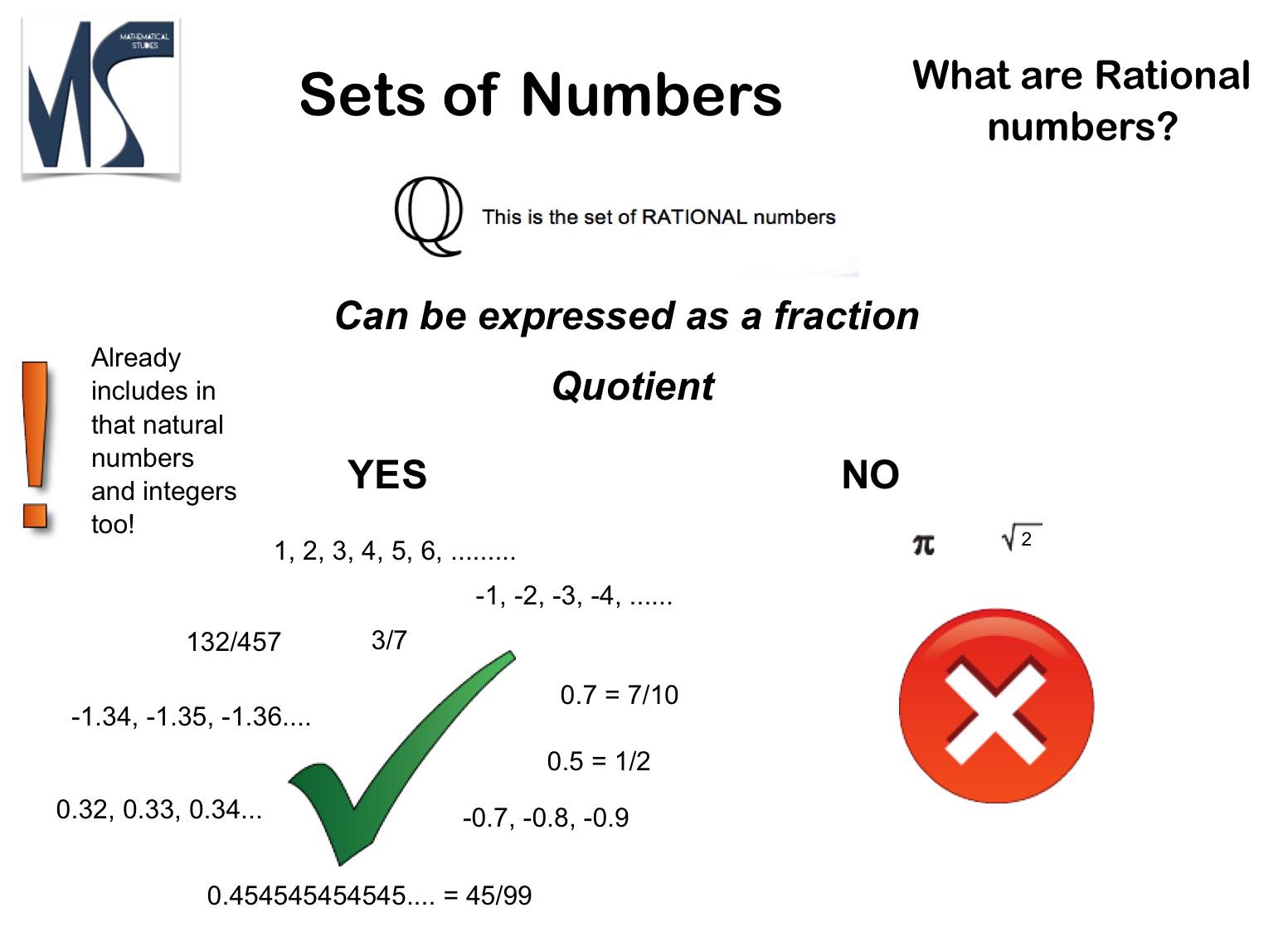 Rational numbers are all the numbers that be expressed as whole. This includes all of the integers because they can all be expressed as fractions too. eg . Not all decimals can be expressed as fractions. Irrational numbers are decimals whose places go on infinitely without any discernable pattern, so that cannot be expressed as fractions.