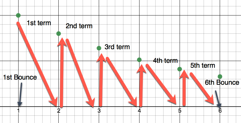 This can be tricky, because the respective heights are a geometric sequence with r = 0.8 (like example 2) but every term except the first should count twice since the ball bounces up and then down. In the first case it only travels that distance (1m) once once
