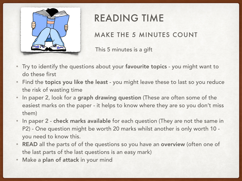 - In paper 2, look for a graph drawing question (These are often some of the easiest marks on the paper - it helps to know where they are so you don’t miss them)