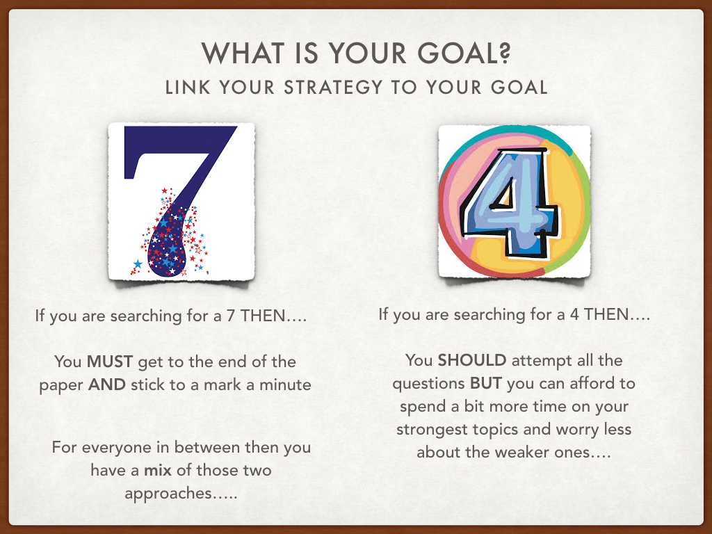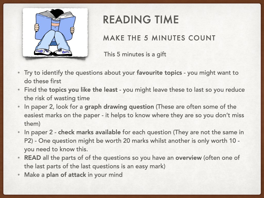 - In paper 2 - check marks available for each question (They are not the same in P2) - One question might be worth 20 marks whilst another is only worth 10 - you need to know this.