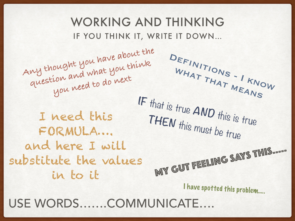 It is crucial that you write down your thoughts as you are working. Your exam paper will be scanned in to a computer and marked by someone, somewhere else who has know idea who you are and how you think. THEY CANT READ YOUR MIND, you have to help them understand what you were thinking, even if you think it is obvious. IF YOU THINK IT, WRITE ITV DOWN
