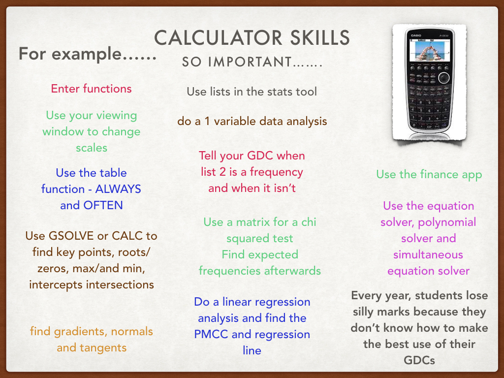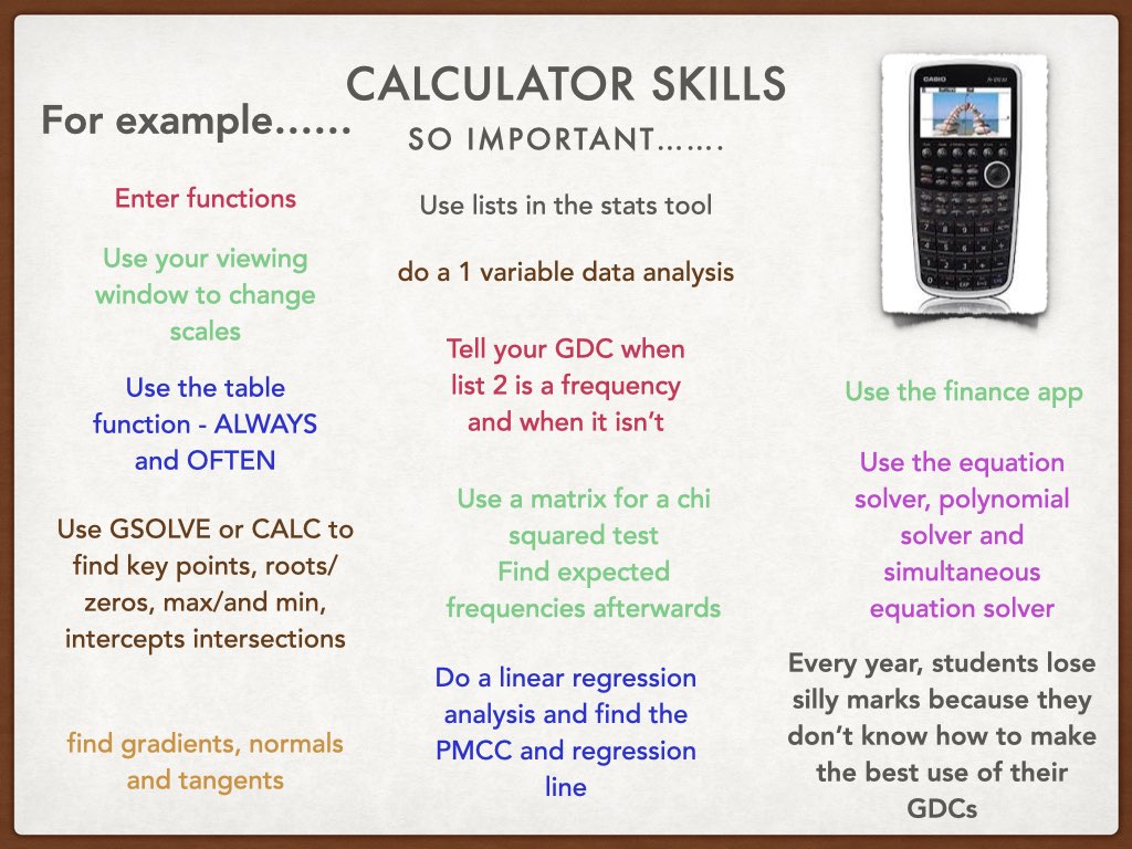 Calculator Skills (sub divisions) Viewing windows, gsolve, lists, frequency, solver