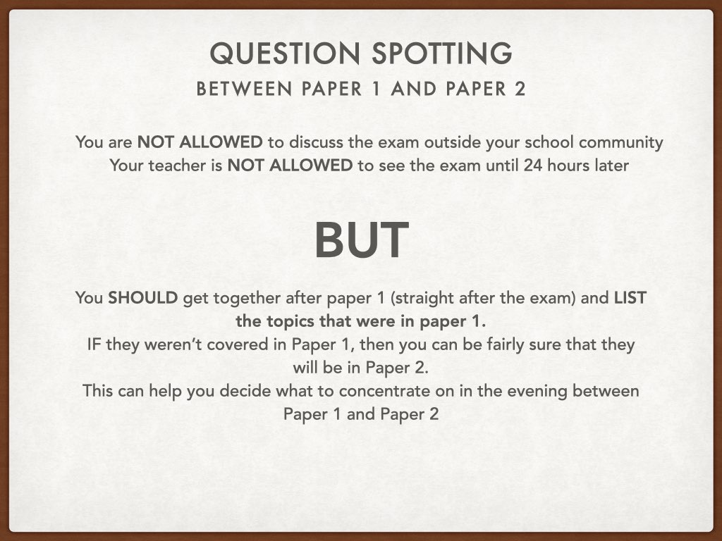 BUT You SHOULD get together after paper 1 (straight after the exam) and LIST the topics that were in paper 1.