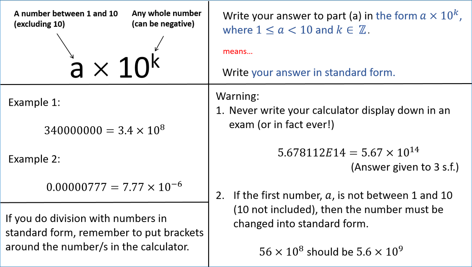 This is a small sup-topic to introduce or recap numbers in standard form. We will learn how to convert between numbers in standard form and base form, alongside learning how to operate with this succinct and helpful way to express numbers.