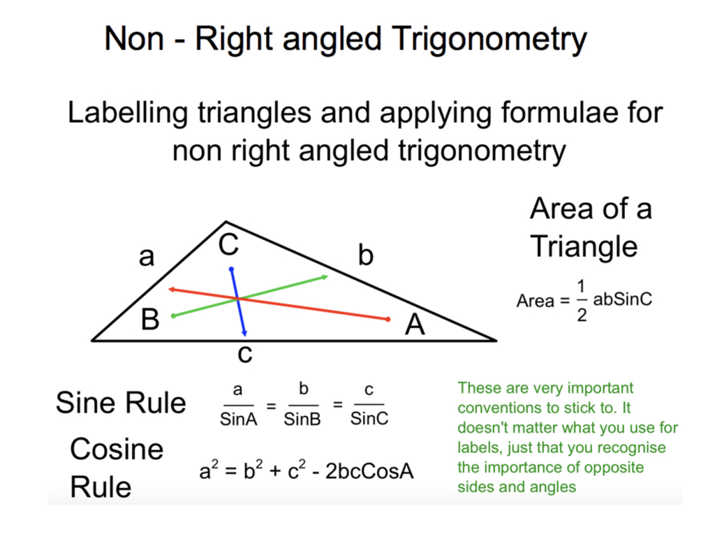 Successfully using trigonometry with non right angled triangles depends on sticking to these important conventions. The key is recognising pairs of opposite angles and sides.