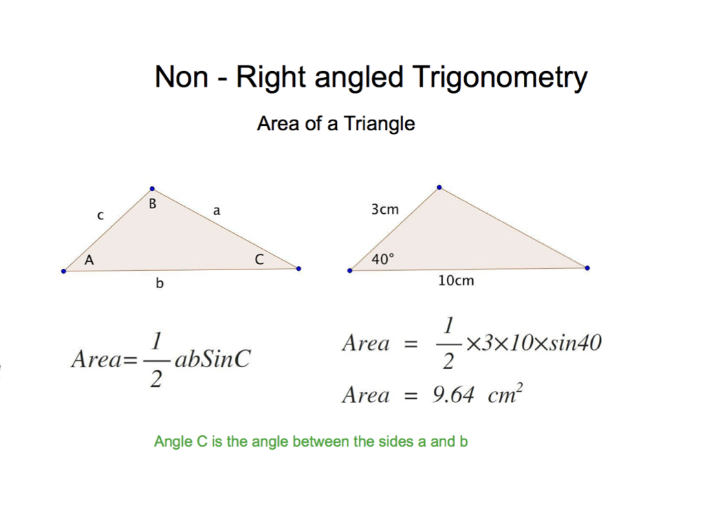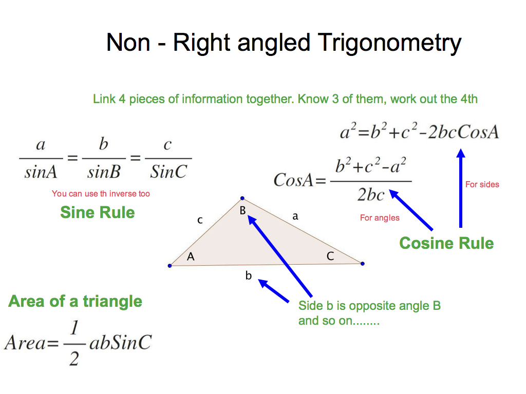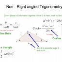 Trigonometry for all triangles Here we take trigonometry to the next level by working with triangles that do not have a right angle. We will work on three key rules. The Sine rule, the Cosine rule and the formula for th area of a triangle. All of these involve linking four bits of information about a given triangle. When you know three of them you can figure out the fourth. These problems are then extended in to three dimensions.