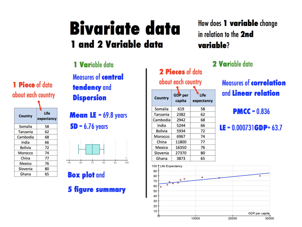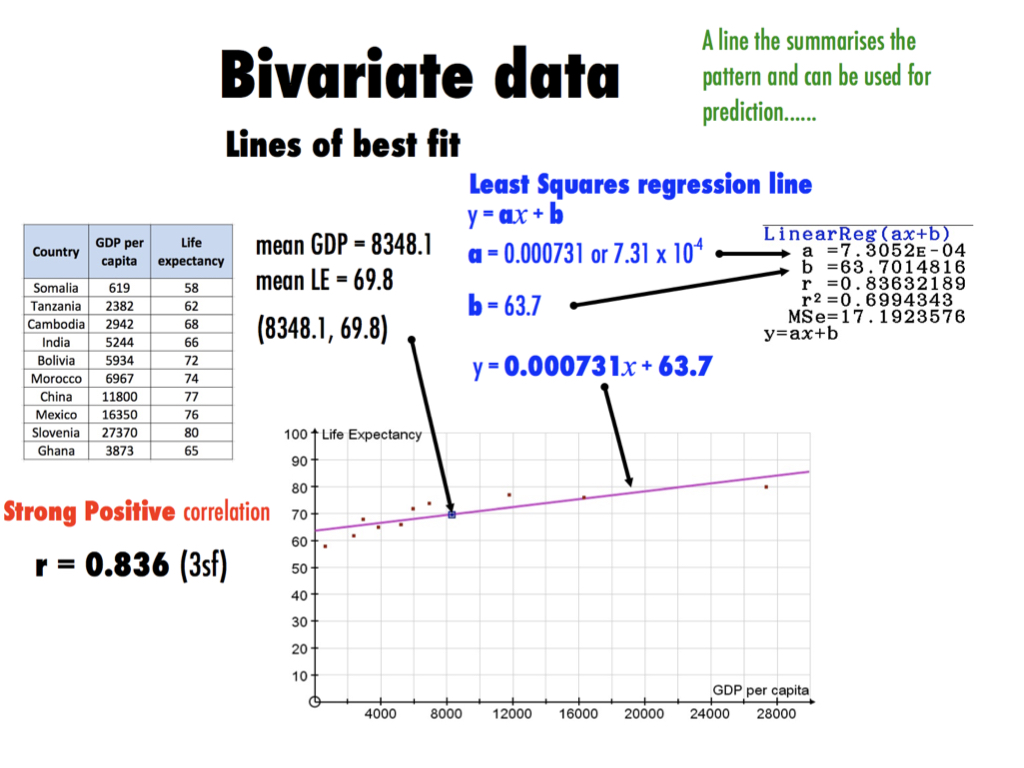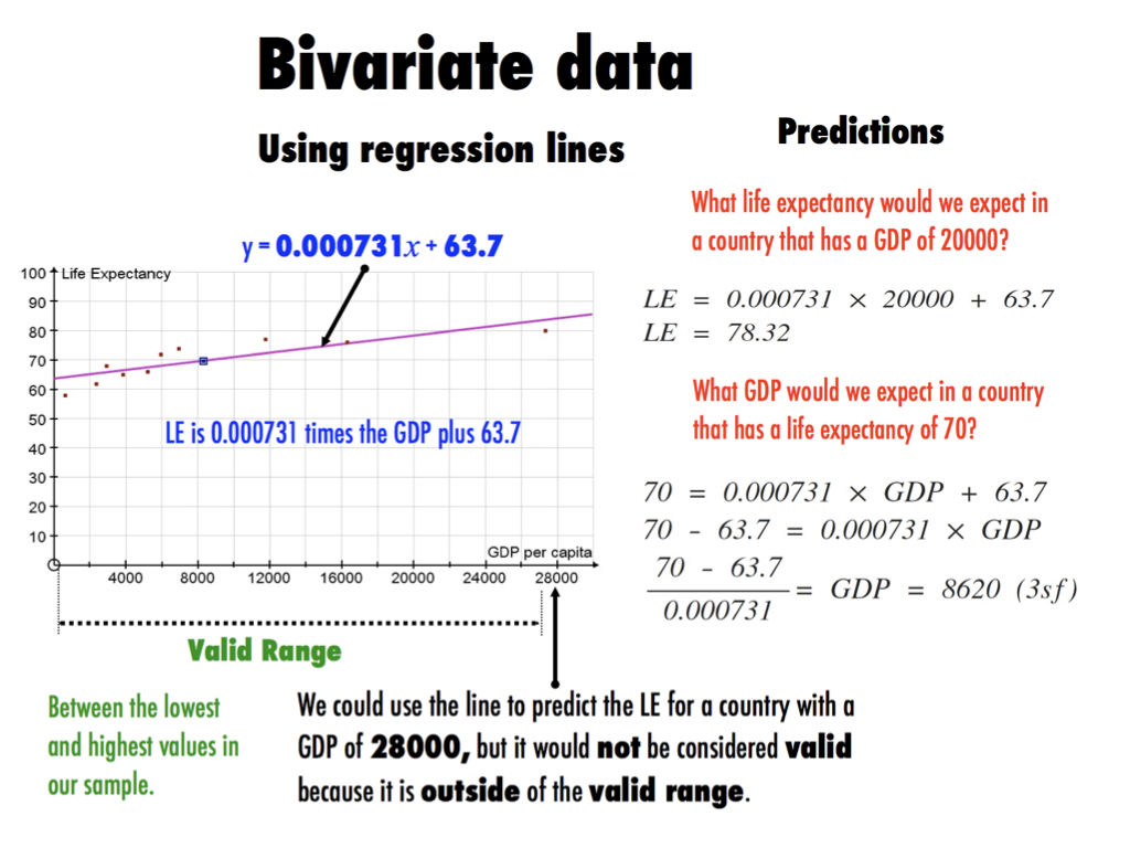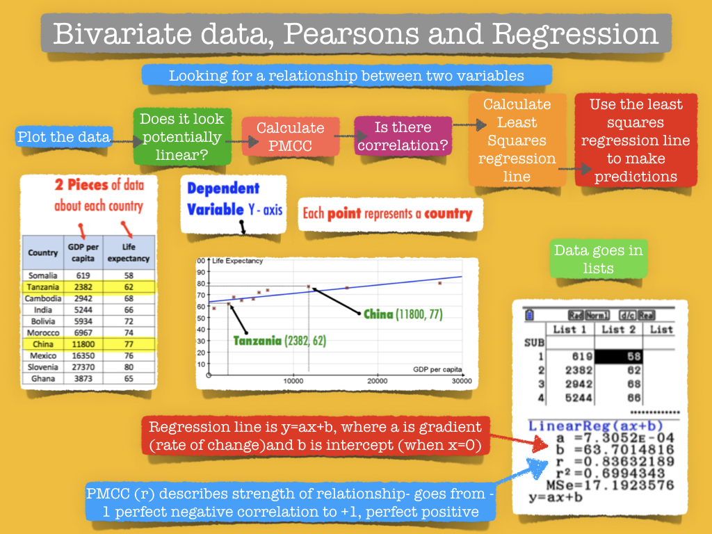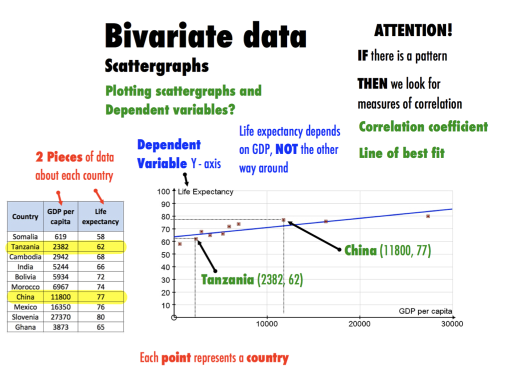 This topic is all about looking for relationships between variables. Does life expectancy depend on GDP? By collecting 2 variables about the things we survey we can use scatter graphs to represent the data and then look for correlation and models that we can then use for prediction.