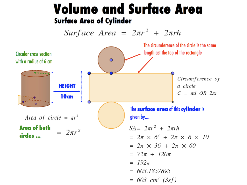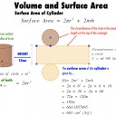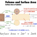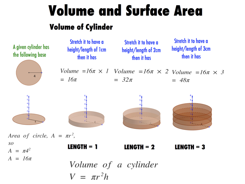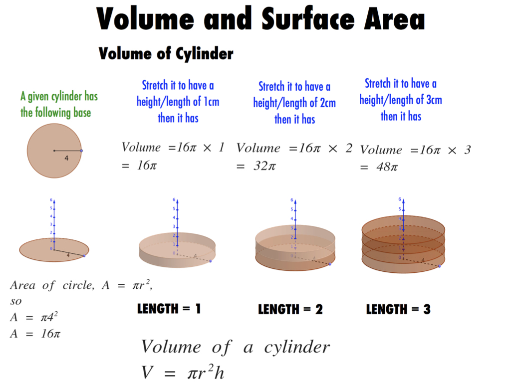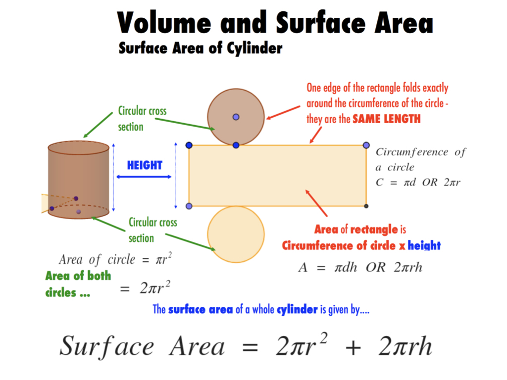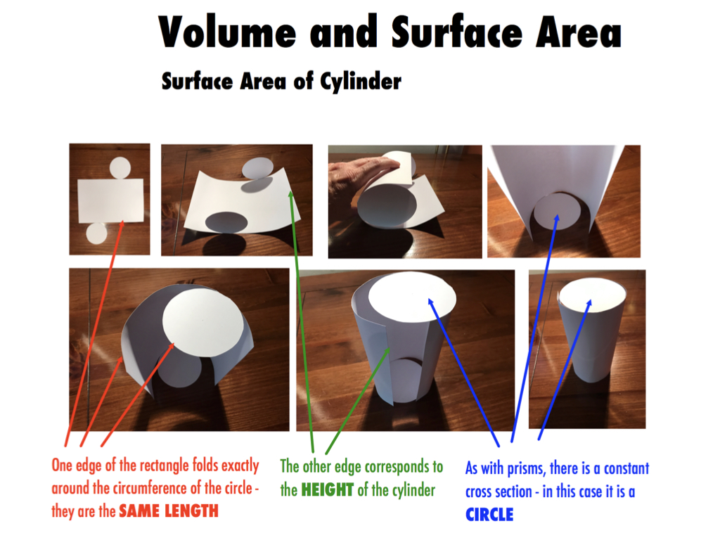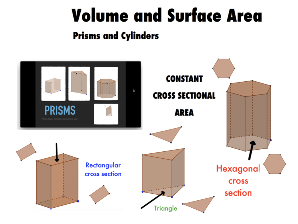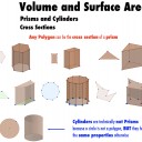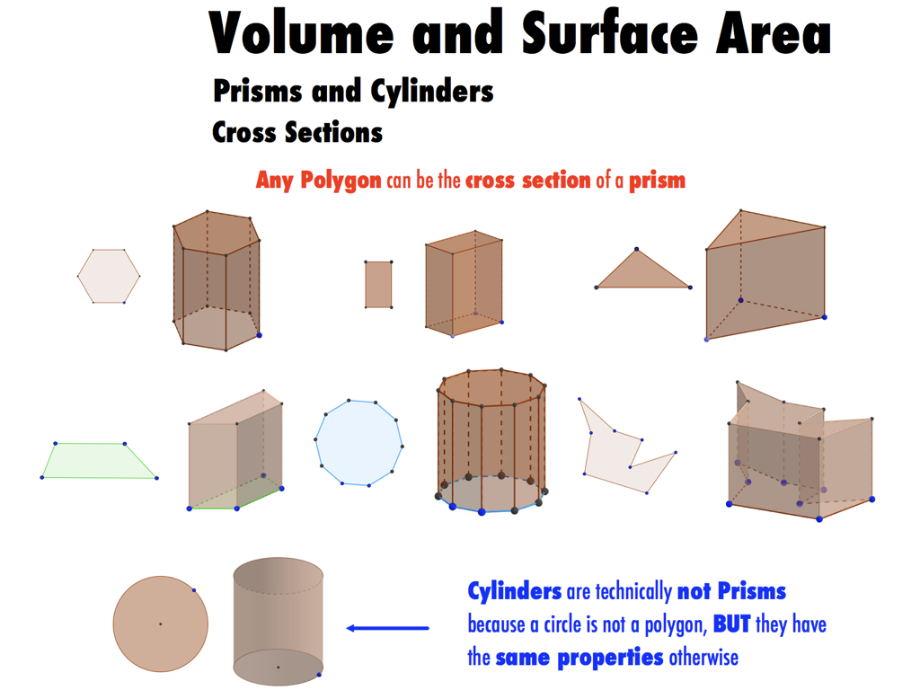 Here are some slides and videos going over cylinders. Cylinders have the same properties as Prisms, but because the cross section is a circle which is not a straight edge there is a bit of extra thinking to do.