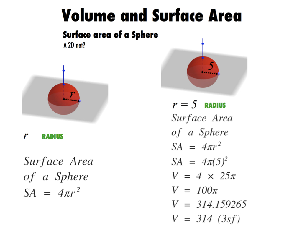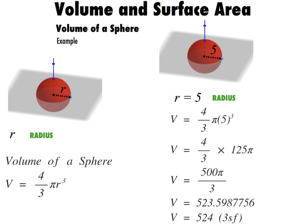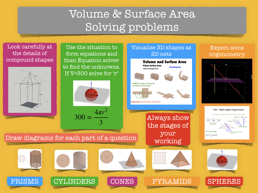 work out the volume and surface area of 3 shapes including prisms, cylinders, pyramids, cones and spheres