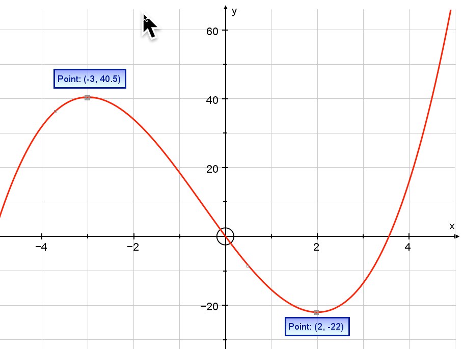 Consider the function \(f(x)\quad =\quad { x }^{ 3 }+\frac { 3 }{ 2 } { x }^{ 2 }-18x\) that has two points at which the gradient is zero. (-3, 40.5) and ( 2, 22).