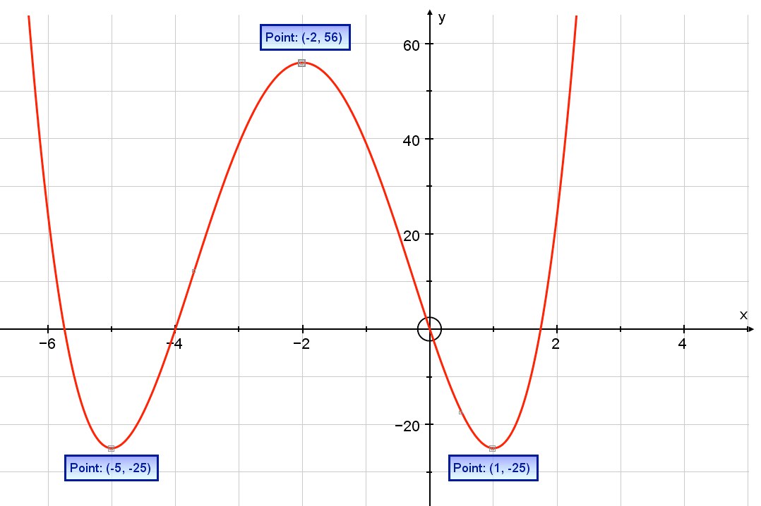 b) \(f'(x)\quad =\quad { 4x }^{ 3 }+24{ x }^{ 2 }+12{ x }-40\\ f'(-5)\quad =\quad -500\quad +\quad 600\quad -60\quad -40\quad =\quad 0\\ f'(-2)\quad =\quad -32\quad +\quad 96\quad -24\quad -40\quad =\quad 0\\ f'(1)\quad =\quad 4+24+12-40\quad =\quad 0\) or using the table function on the GDC