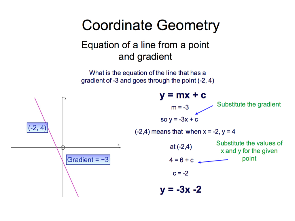 Therefore the gradient, a = -2. So you know y = -2x + b, which means the line goes through the point (-2, 12). Now substitute x = -2 and y = 12 (from the gievn point) to get the value of b.