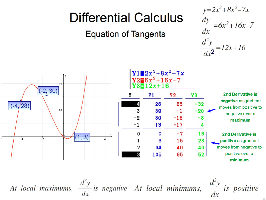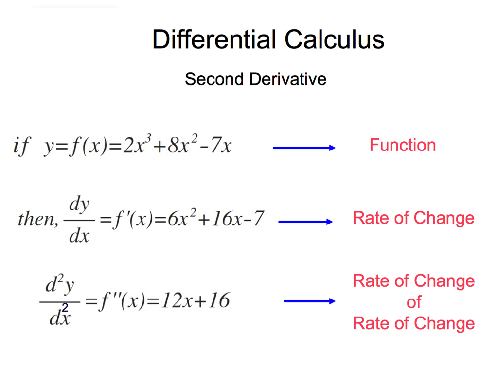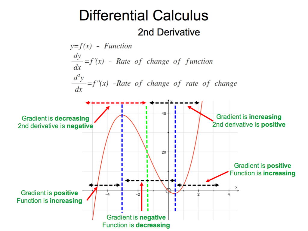 Here we look at the 'rate of change' of the 'rate of change'. A key idea that helps us identify local maximums and minimums.