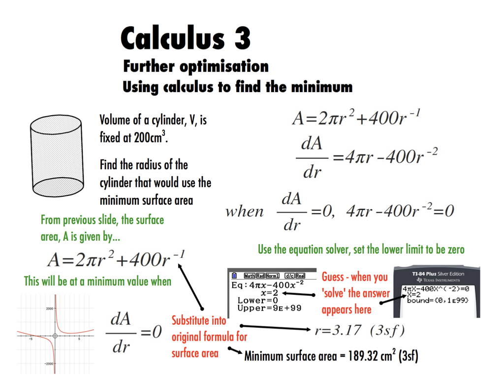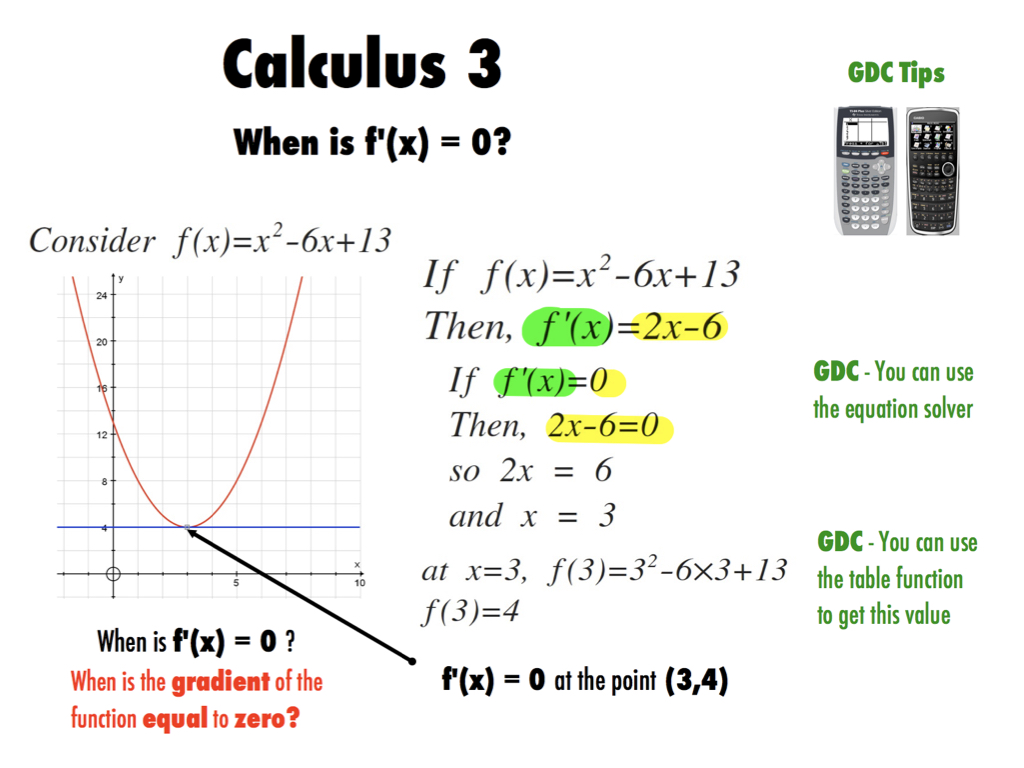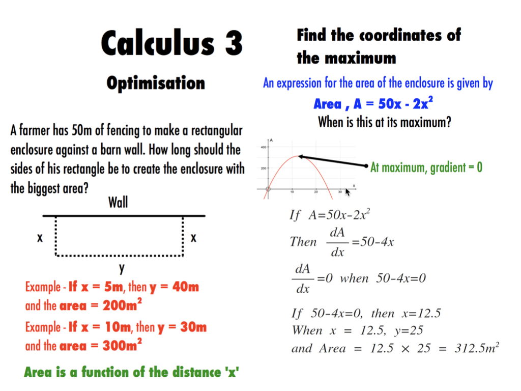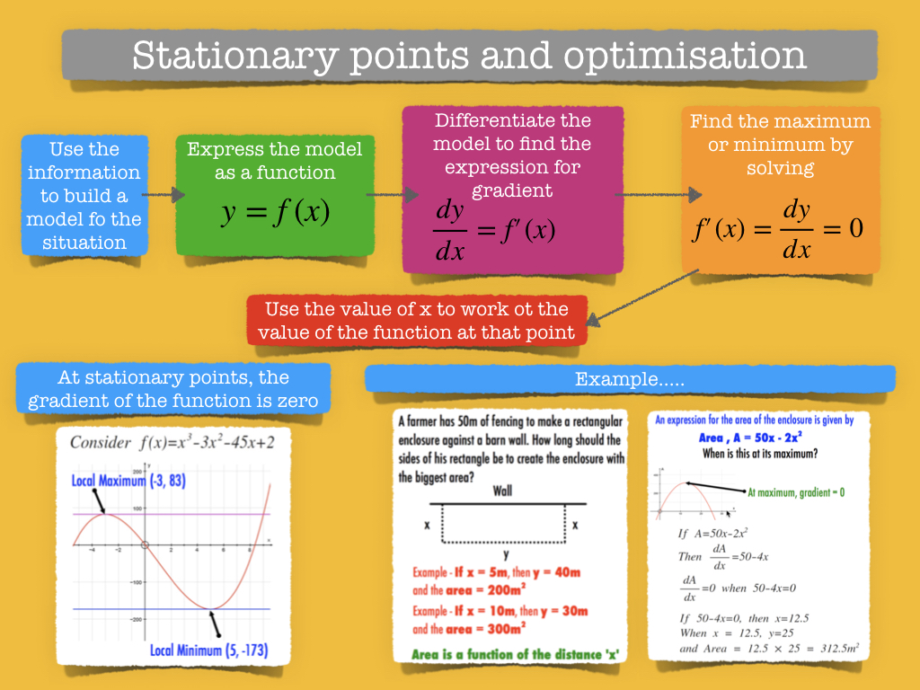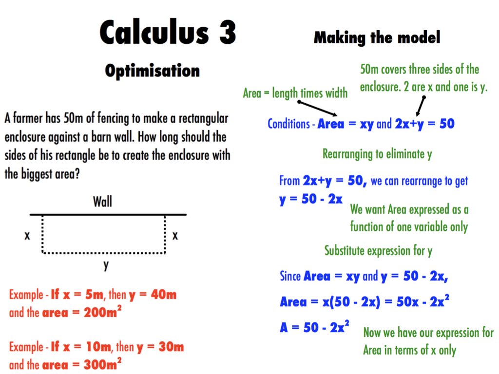 This is the part where we learn about how we use calculus to solve different kinds of problems. So far we have spent a lot of time learning about how calculus helps us to work out the gradient of given function for any given point. In this section we focus on the points where the gradient is zero. These are called the local maxima and minima and crucial in what we call 'optimisation' where we try to work out how to maximise profits or minimise costs and so on.