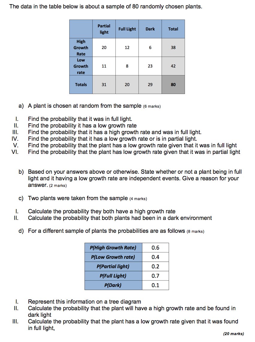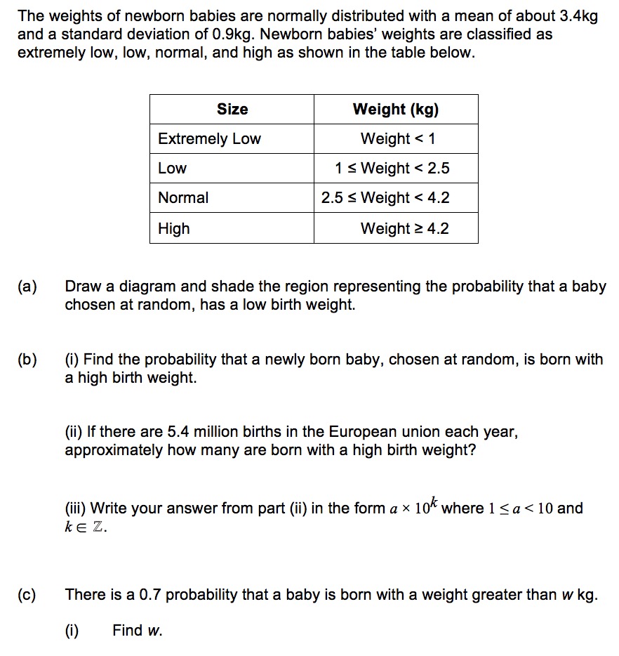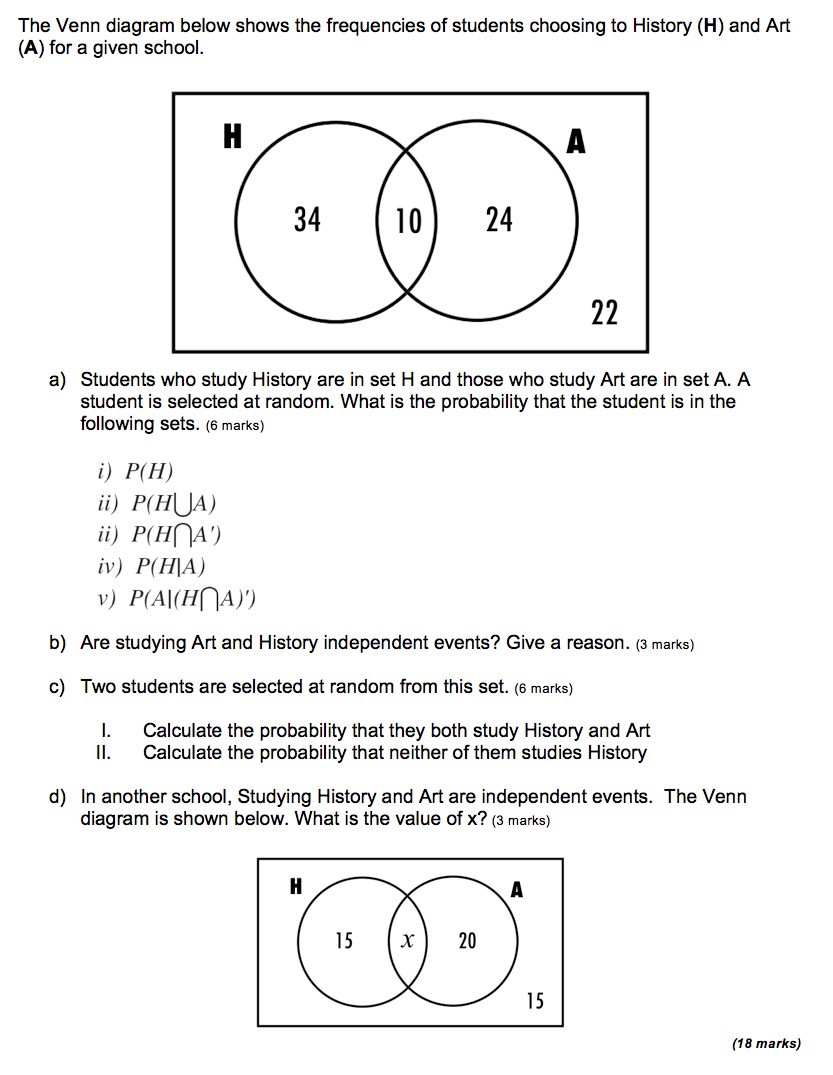 The following are exam style questions for the sub-topics in the functions unit. There are questions with video solutions here for here for Statistical concepts, cumulative frequency and box plots, central tendency and dispersion, bivariate data and linear correlation, probability, discrete random variables, binomial distribution, normal distribution, spearman's rank and chi squared tests!
