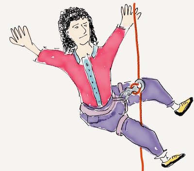 A rock climber descends a cliff at constant velocity using a friction device. There is so much rope hanging below the climber that she is able to descend 20 m without holding the rope (never do this). Calculate the rise in temperature of the device.