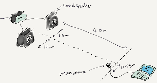 Two loudspeakers placed as shown in the diagram. Each emits an identical sound of frequency 309 Hz. A microphone is used to detect the sound at different points along a line parallel to the speakers. Deduce that there willl be a minimum loudness at the position shown.