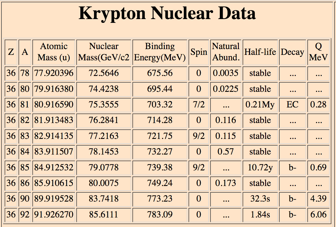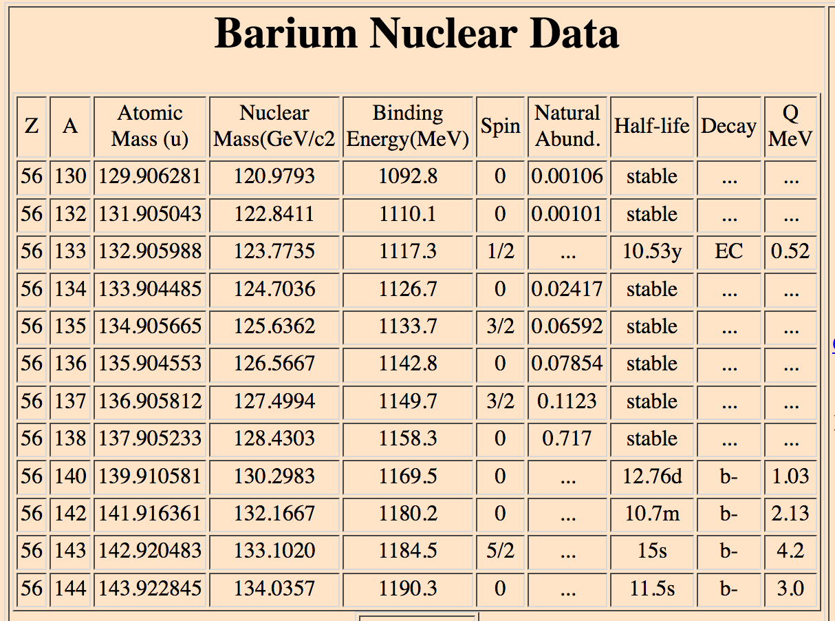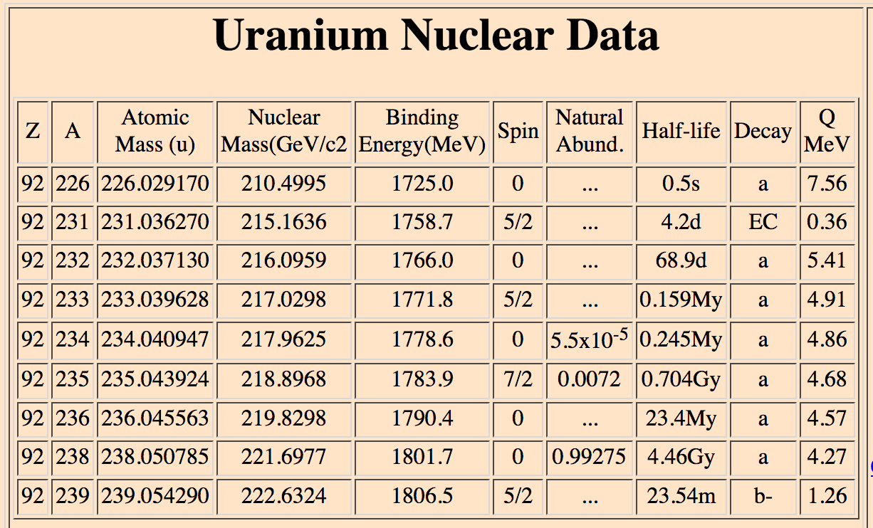 Use information in the tables below (from Hyperphysics) to calculate the energy released in the following reaction.