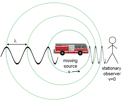Doppler shift is also experienced when an observer moves towards or away from a source that is stationary relative to the medium. This effect is simply due to the relative velocity between the observer and source.