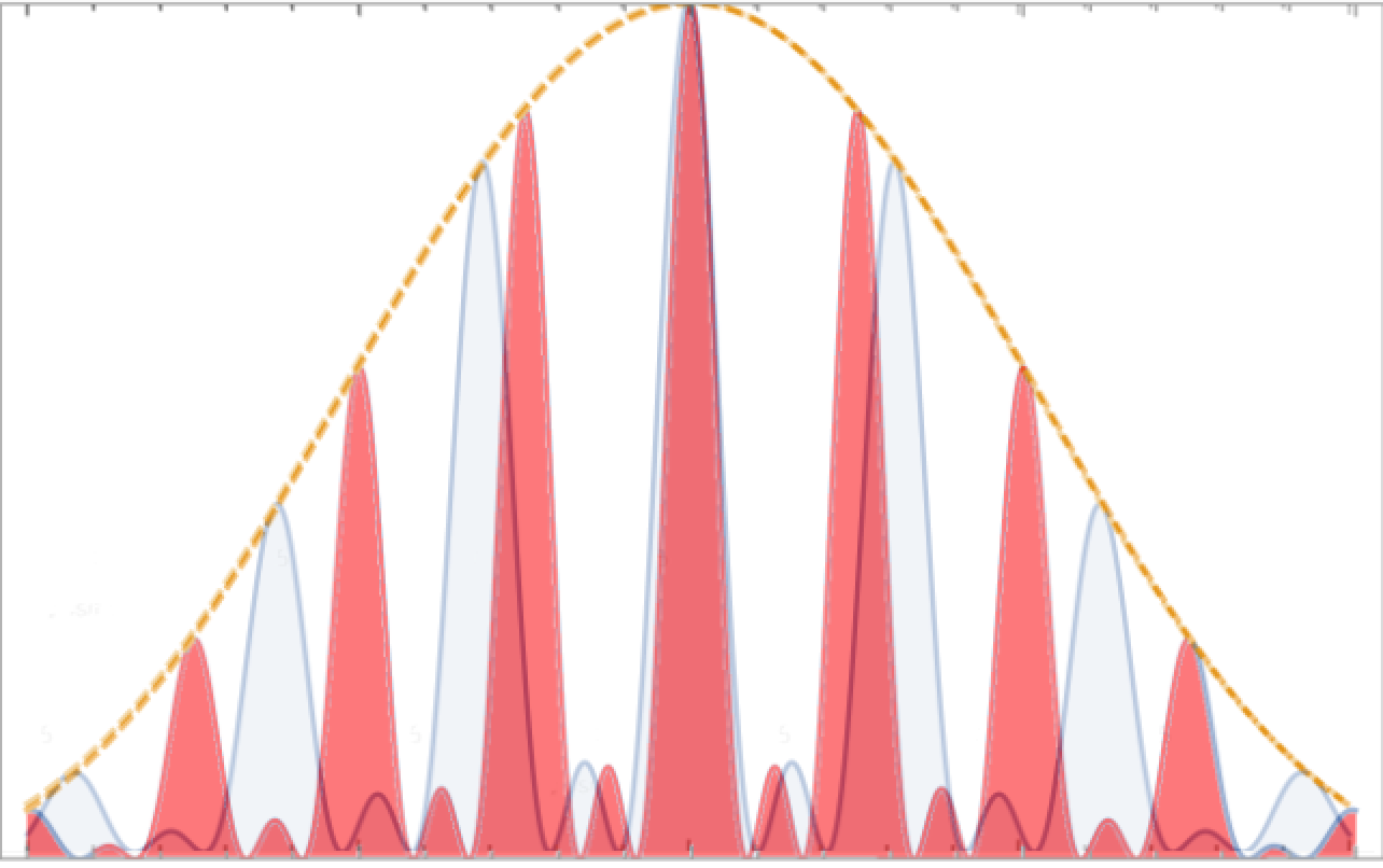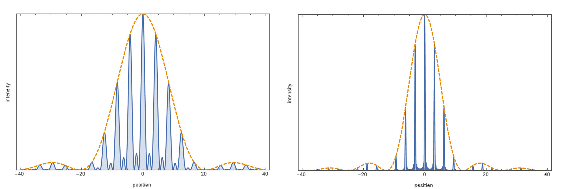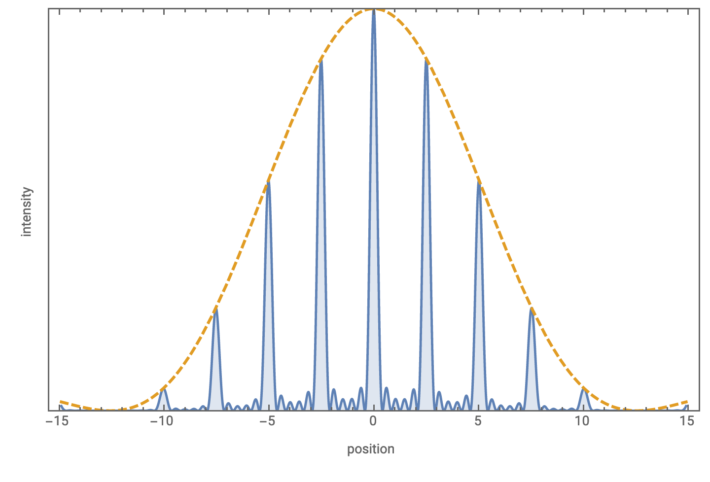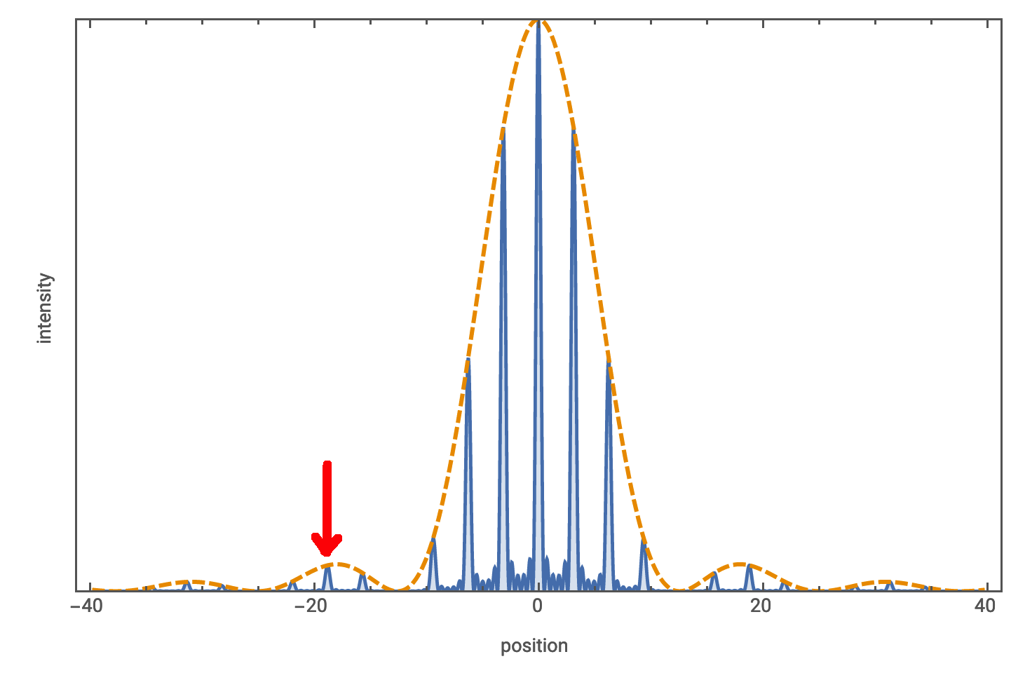 When we look beyond the interference pattern shown above, we notice that the intensity of the maxima appears not to follow a straightforward pattern of reducing outward from the centre.
