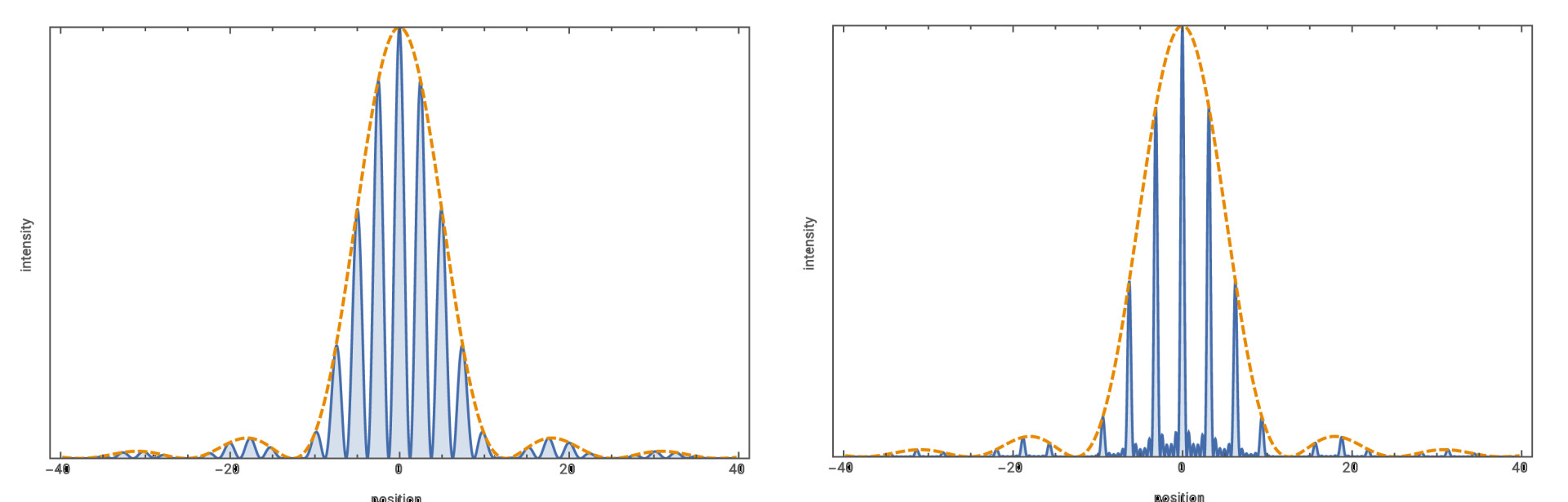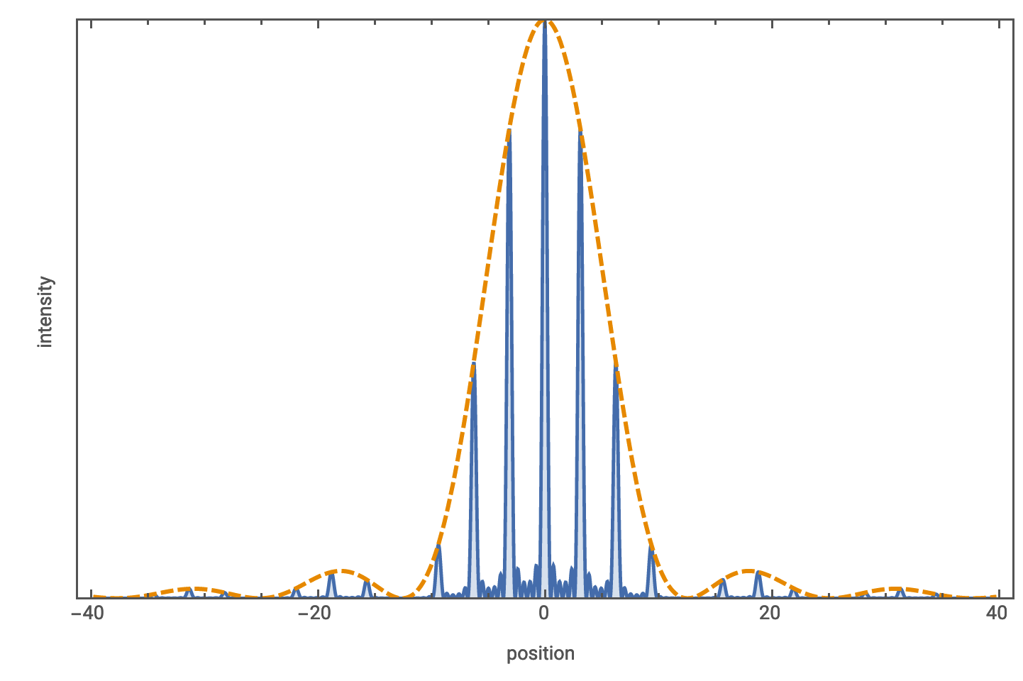 The two-slit interference pattern is modulated by the one-slit diffraction effect.