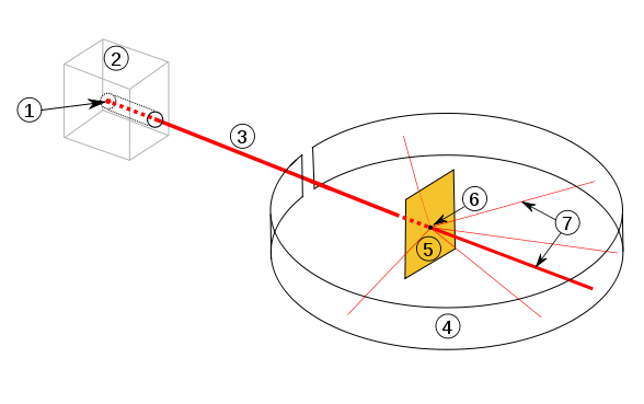 As the angle is increased from the initial beam direction, the number of alpha particles decreases. This is due to the repulsive elecric forces between the alpha particles and the nucleus, which increases in magnitude with shorter distances. The scattering distribution can be predicted by an equation devised by Rutherford (not required for the course).