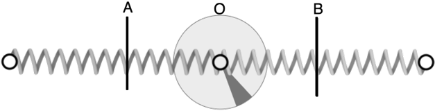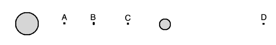 The image represents 2 large masses of equal density. Which point will have the lowest potential?