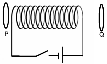 The image represents a solenoid with metal rings placed coaxially at either end. When the switch is closed an EMF is induced in each ring.