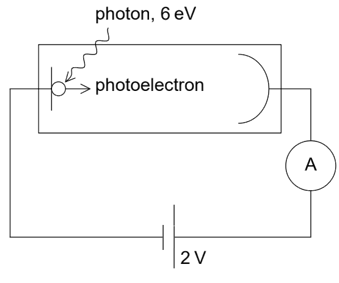 A photoelectric cell is connected to a battery of emf 2 V and illuminated by photons of energy 6 eV.