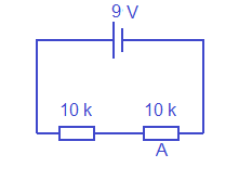 The combined resistance of A plus voltmeter wil be 5 kΩ so th the pd across A will be 1/2 the pd across the other resistor. The total is 9 V so that makes 6 V across one and 3 V across the other.